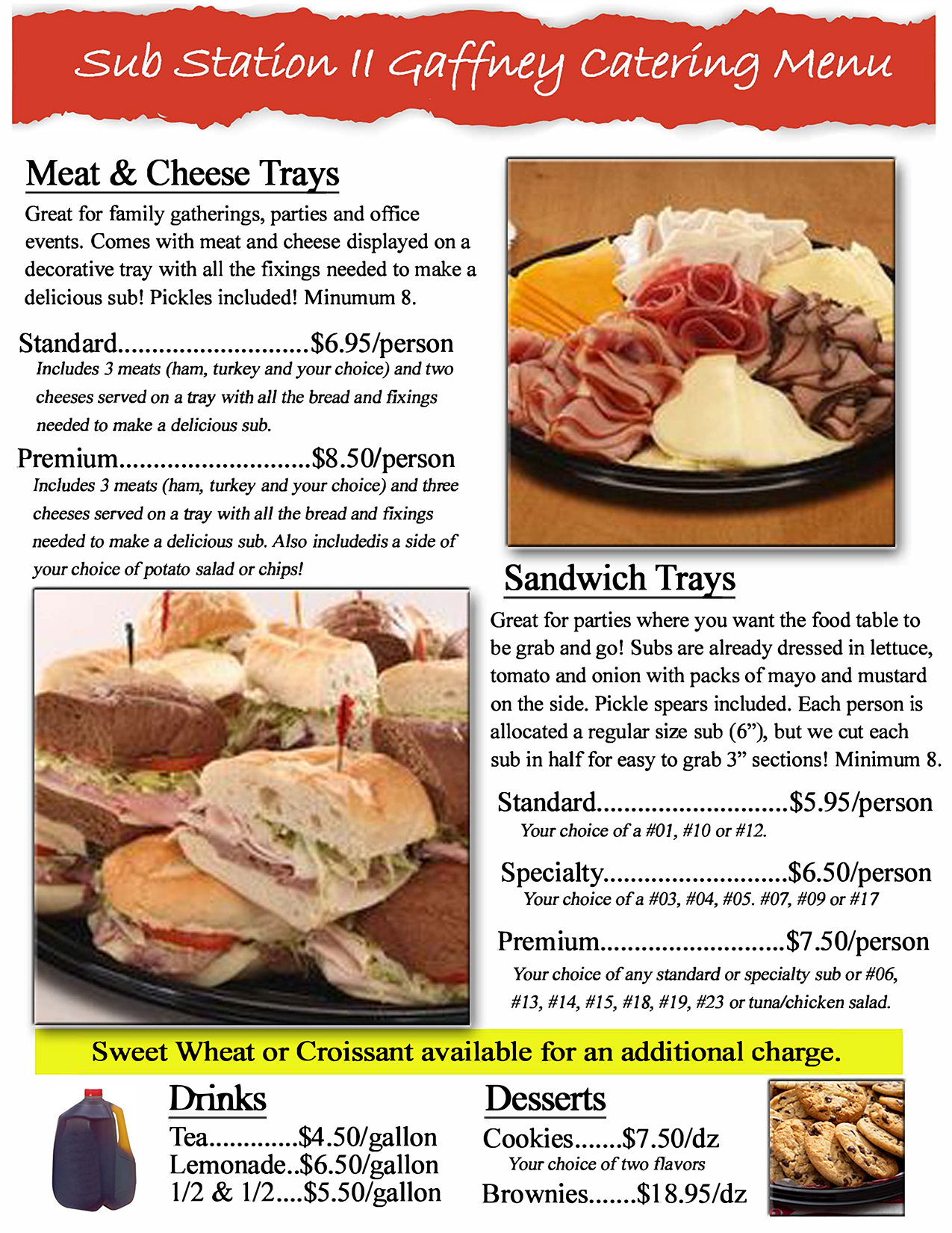 At Sub Station II of Gaffney we offer a variety of catering options to fit your needs. Boxed Meals are great for an office lunch or on-the-go field trip. Meat and Cheese Trays allow your guests to build their sub to their liking and are perfect for family meals, holiday gatherings and even wedding rehearsals. Our Giant Salads are always a delicious and healthy addition to your table and our Sandwich Trays offer an easy grab-and-go option for birthday parties, baby and bridal showers.